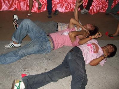 So gegen 3 Uhr glaub ich sind wir dann aus dem Club raus geschmissen worden. Allerdings gings dann nicht gleich nach Hause :-) Draussen vor der Disko hat sich noch so einiges abgespielt. So fanden es ein paar Thai Jungs lustig quer ueber den ganzen Vorplatz der Disko zu rollen, aber auch wir haben nicht untaetig zugesehen. Dort gabs naemlich wegen der Neueroeffnung ueberall viele Luftballons. Naja die gabs da, nachdem wir naemlich gegangen sind, waren da wenn ueberhaupt nur noch die Haelfte :-)