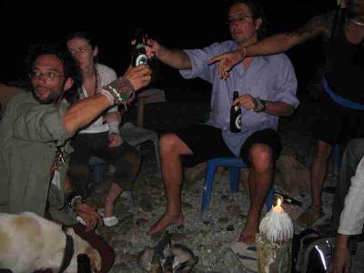 Nach unserer Stadttour haben wir uns noch ein bisschen zu Leuten am Strassenrand gesellt. Da hatte sich ein Franzose mit einem Thailaender eine Art Wigwam aufgestellt unter und vor dem die Leute mit Getraenken aller Art bedient wurden. War ganz chillig, auch wenn der Franzose, ganz links im Bild, die ganze Zeit mit dem Lagerfeuer rumgespielt hat. So wie der sich verhalten hat wuerde ich auf stoned tippen!