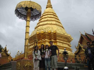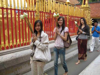 Ganz anders war es da schon in Chiang Mai, wo es dann am Dienstag Abend letzter Woche hin ging. Mr. Anurod, der den Trip das WE zuvor geplant hat, hat naemlich mitbekommen, dass ich vorhabe nach Chiang Mai zu gehen und kurzerhand die Maedels vom WE zuvor, die dort studieren kontaktiert. So hatte ich fuer den ganzen Mittwoch meine private Fuehrung :-) War sehr angenehm mit denen sich dort um zuschauen! Wurde am morgen von denen mit dem Auto direkt von meiner Unterkunft abgeholt und musste nur sagen was ich sehen will, da gings dann auch sofort hin. Zuerst hab ich noch zu denen gemeint, sie sollen mir doch einfach das zeigen, was am sehen wertesten in Chiang Mai ist, aber da wussten sie nicht so recht mit was anzufangen. Ich glaub war auch besser so, weil ich ansonsten eine Fuehrung durch saemtliche Tempel dort bekommen haette. Von anderen Studenten aus Bangkok wusste ich aber, dass eine Tempelanlage auf einem Berg besonders sehenswert sei. Da gings dann auch als erstes hin.