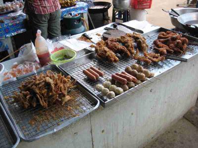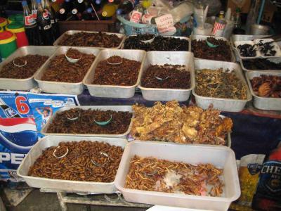 Nicht weit vom Wasserfall gabs ein paar Essensstaende. Einer davon hat so ziemlich alle Insekten angeboten, die ich in Thailand kenne. Da gabs von normalen Maden und Heuschrecken auch andere Delikatessen, wie Skorpione, Tintenfische, so ne Art frittierte Huehnerbeine und alle Sorten von groesseren Kaefern, frittiert versteht sich. Moechte wirklich nicht wissen wer das wirklich isst!? brrr