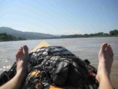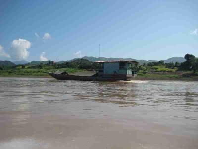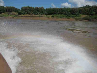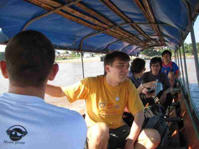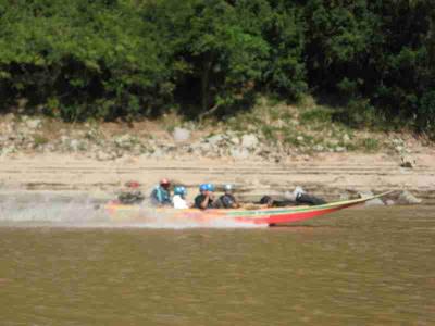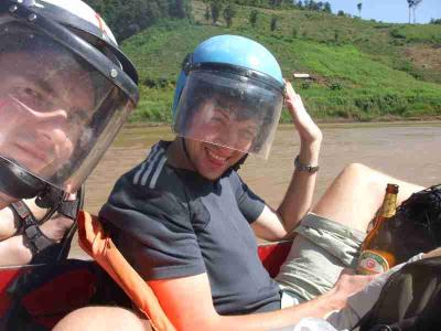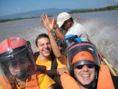 Das ganze war auch nicht unbedingt ungefaehrlich, daher auch die Schwimmwetsen und Helme. Wir sind naemlich schaetzungsweise mit 60 bis 70 Sachen ueber den Mekong geduest, der ziemlich gewaltige Stromschnellen und tueckische Felsen hat. War aber ein Heidenspass und alleine die Bootsfahrt war ein riesen Erlebnis.