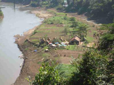 Dazu beigetragen haben auch noch die direkt am Fluss errichteten temporaeren Gemuesegaerten. Der Mekong Fluss bringt naemlich grosse Mengen fruchtbaren Schlamm mit sich, der, wenn das Wasser gerade nicht so einen hohen Stand hat, sich optimal fuer ein oder zwei Ernten von verschiedensten Gemuesesorten eignet. Das naechste Bild zeigt eine der groessten Anbauflaechen, die ich dort gesehen habe. Ansonsten hat man wirklich jede erdenkliche Flaeche dort genutzt, sei sie auch noch so klein.