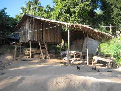 Hier mal ein Bild von den Haeusern dort. Natuerlich gabs auch vereinzelt bessere, aber gerade auf dem Bild fande ich den Kontrast, der sich aus der Kombination von deren Welt mit der modernen Welt ergibt extrem. Wenn man naemlich genau hinschaut, kann man links neben der Huette den Satellitenempfaenger erkennen. Ich habe das zuvor schon einmal ueber Thailand gehoert, dass Leute dort noch so arm sein koennen, aber ein Fernseher gehoert zur Grundsuasstattung. Muss wohl auch fuer Laos zutreffen.