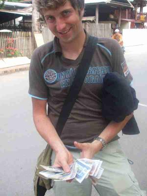 Zwischenzeitlich hat sich auch mein Geld schlagartig erhoeht. Fuer 1000 Baht, das sind ca. 20 Euro, hab ich mir laotisches Geld geben lassen. Die Waehrung nennt sich Kip und 1 Baht ist ca. 280 Kip, d.h. ich hatte ploetzlich 280000 Kip in der Tasche. Waere ein Leichtes gewesen dort Millionaer zu sein, aber in 2 Tagen schafft man es nicht so einfach 4000Baht auszugeben :-) Ok zugegeben zu schaffen ist das schon, aber ich wollte nicht den ganzen Kram wieder die ganze Reise zurueck mit mir rumschleppen!