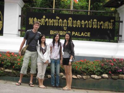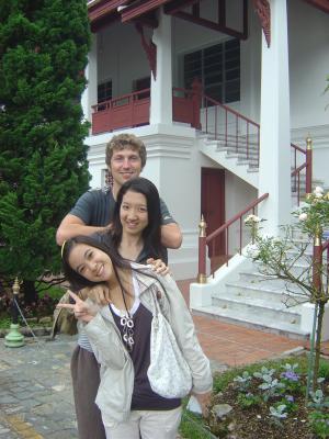 Erstes Ziel war, nach einer ziemlich kurvigen und langen Fahrt auf den Gipfel, der Phu Ping-Palast. Der Berg hiess Doi Suthep und war mit 1670 Metern wirklich hoch, daher auch selbst fuer mich ziemlich frisch, gerade am Morgen. Auf dem naechsten Bild seht ihr die Maedels mit mir davor, erst kurz nach der Ankunft. Nach 5 Minuten dort haben sie aber schon angefangen zu frieren, trotz Jacke :-)