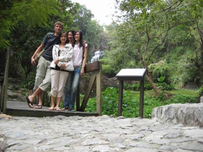 Am Fusse des Berges gabs aber erst noch einen Wasserfall zu sehen, sogar mit freien Eintritt. Hier seht ihr die Maedels und mich davor.
