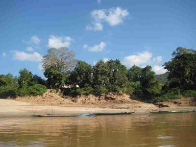 Dort liegt naemlich ein kleines Dorf namens Xieng Men, das neben einem Markt auch ein paar Tempel und Hoehlen zu bieten hat. Um euch mal ein besseres Bild von den Transportmitteln auf dem Mekong verschaffen zu koennen, dieses Bild. Wir Fuer den Transfer auf die andere Seite mussten wir mit dem Boot ganz links, aehnlich dem kleinen in der Mitte vorlieb nehmen. War aber vollends ausreichend fuer den Zweck.
