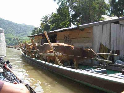 Hier zum Vergleich mal ein Slowboot, das zwar komfortabler war, aber bestimmt die doppelte Zeit fuer die Strecke benoetigt hat. Wir sind da teilweise wie im Slalom an denen vorbeigeschossen!