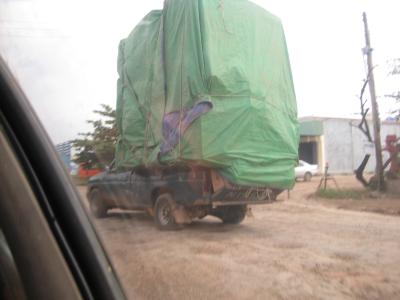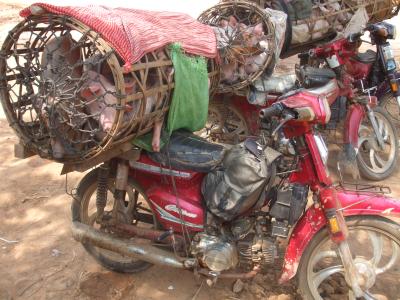 Entschuldigt ein bisschen die schlechte Qualitaet der Bilder, aber die meisten sind bei holbriger Fahrt, Staub, dreckiger Scheibe und ner Reaktionszeit von ca. 10 Sekunden meine Kamera rausholen, entstanden. So kann man auch nur erahnen, was das Motorrad auf dem naechsten Bild wohl so transportiert. Wenn mans weiss gehts. Es muessten so ca. 20 bis 30 Huehner sein, die alle kopfueber an ner Stange hinter dem Fahrer herumbaumeln :-)