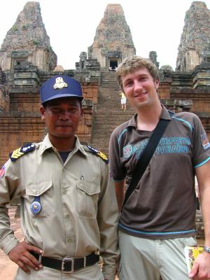 Hier siehts man den Tempel noch von unten. Das Bild mit dem Polizisten hat ne ganz lustige Geschichte. Eigentlich wollte er garnicht mit aufs Bild, er hatte nur versucht mir seine Marke und andere Dinge, die er bei sich hatte, als Souvenir anzudrehen. Seine Uniform wollte er mir aber nicht verkaufen :-)