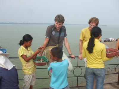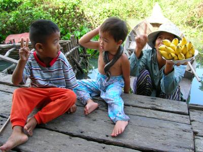 Endlich nach 5 Stunden Fahrt fuer ca. 120 Kilometer ging es, da es noch hell war, gleich weiter zu einem See suedlich von Siem Reap. Dort haben uns gleich Kinder abgefangen die 5 Armbaender fuer nen Dollar verkaufen wollten und einfach nicht locker gelassen haben. Ich glaub letztendlich hat da jeder um seine Ruhe zu haben ein paar gekauft, allerdings mit der Wirkung, das nur noch mehr Kinder hinzugekommen sind :-) Haben uns dann auf ein Boot gerettet und sind zu ner Insel auf dem See aufgebrochen.
