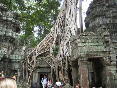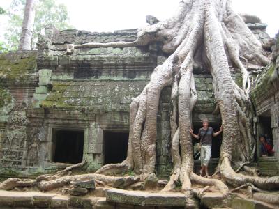 Nunja, die vorherigen Tempel waren eher freistehend, wir hatten aber alle ein Bild im Kopf von einem Tempel, der so langsam vom Urwald wieder zurueckerobert wird. Mit dem Ta Prohm Tempel haben wir dann genau so einen gefunden. Hier gab es Baumriesen, die in Mitten des Tempels wachsen und ihre Wurzel ueber Mauern und sogar in die Mauern der Tempel hineintreiben. Ein echt cooler Anblick! Der Tempel hat mir eigentlich am besten gefallen!