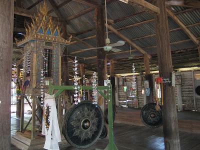 Den Abend gings z.B. nach dem Farmbesuch zu einer Versammlung in einem Tempel. Er hat mich dort einfach mit hin geschleppt, in dem Glauben lassend, dass wir dort den Tempel seines Dorfes anschauen wollen. Dem war dann halt nicht so! Die Versammlung hat dann doch ganze 2 Stunden gedauert, in denen ich bis auf teilweise das Wort Farang (Bezeichnung fuer westliche Auslaender) nichts verstanden habe. Da ging es irgendwie darum, ob doch ein alter schon ziemlich vom Zahn der Zeit geplagter Tempel an einer neuen Stelle platziert werden soll, oder doch als antiker Tempel dort belassen und statt dessen restauriert werden soll. Mir wurde dazu eine Diskussion versprochen, erlebt habe ich viele Reden einzelner Personen und einen ploetzlichen Applaus. Danach war dann die Sache beschlossen!? Wie die dabei abgestimmt haben, hab ich nicht herausfinden koennen, jedenfalls bleibt der alte Tempel dort stehen wo er bereits steht. Auf dem kommenden Bild sieht man einen Ueberblick ueber das Gelaende dort. Der alte Tempel im Fordergrund des Neueren und im Hintergrund bereits ein noch neuerer Tempel im Bau.
