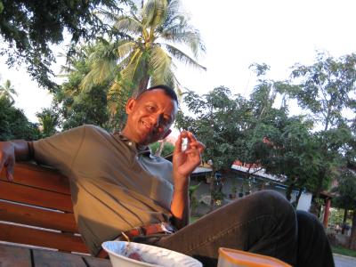 Am naechsten Tag gabs dann ein kleines Katerfruehstueck vor dem Haus seiner Schwester. Vielmehr waren das fuer mich erst suess wirkende Teilchen, d.h. Backwaren, die dann letztendlich doch mit Fleisch und Zwiebeln gefuellt waren, aber trotzdem suesslich geschmeckt haben. Bin dann wieder auf meine Bananen bzw. Mango umgestiegen ;-) Der Platz vor dem Haus war ziemlich chillig, so unter Palmen und bei Sonnenschein.