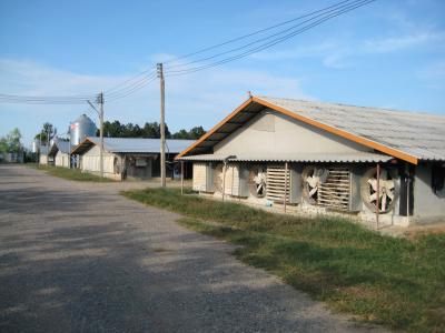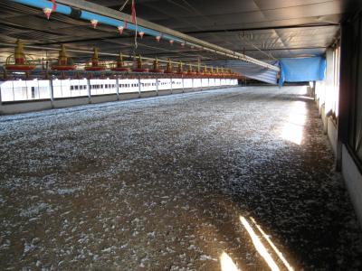 Insgesamt sind das 5 riesige Hallen mit jeweils so ca. 20000 Huehnern Kapazitaet, die im grossen Stil dort gemaestet werden, um dann nach ca. 50 bis 60 Tagen groesstenteils ins europaeische Ausland verkauft zu werden. Danach stehen zwecks Reinigungsarbeiten und Praevention von Vogelgrippe die Genaeude einen Monat leer, daher auch nur ein Bild von Innen, so ganz ohne Huehner.