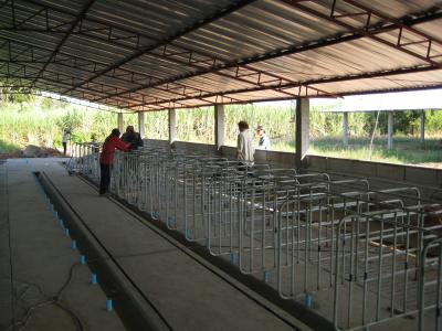 Das Gebaeude ganz hinten in vorherigen Bild ist hierbei das neue fuer die Mutterschweine (MaeMooooh ;-) ) Hier entsteht alles noch in richtiger Handarbeit, so wurden z.B. die Gitterteile im naechsten Bild nicht, wie in Deutschland ueblich, zugekauft, sondern alle vor Ort gebogen und zusammengeschweisst. Auch muss man sich hierzulande nicht allzu grosse Sorgen um die Temperaturen machen, vielmehr mehr um ausreichende Kuehlung, weswegen grosse Ventilatoren an der Stirnseite der Gebaeude vorgesehen sind.