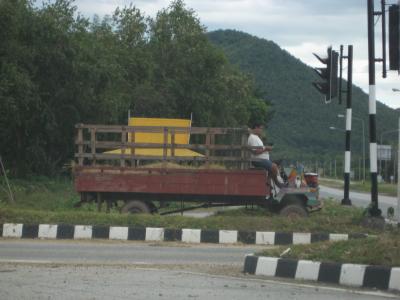 aber nach 3 Stunden wollte ich nur ankommen. So manches Gefaehrt war dann wieder einmal eine willkommene Abwechslung. Dies hier ist z.B. typisch fuer laendliche Gegenden. Ist eine Art Traktor und Auto zugleich fuer die Bauern dort und man sieht die an jeder Ecke. Ohne Kabine geht das auch nur in waermeren Laendern, der Sinn fuer Sicherheit ist hier noch nicht so ausgepraegt, daher auch keinen Ueberrollbuegel!